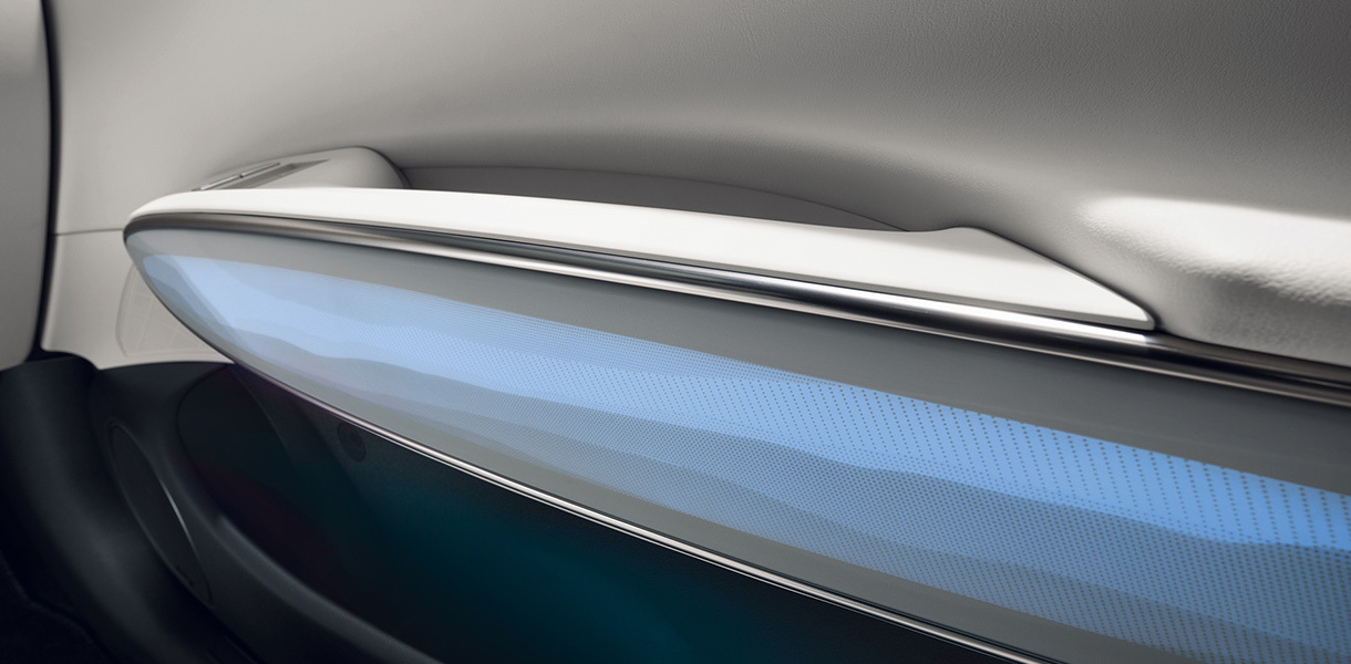 The display extends across the dashboard to create an elegant visual presence that instantly catches the eye of everyone who enters the cabin. The 27" wide OLED Display integrates the navigation and instrument cluster to provide a sharp resolution and a high-tech feeling.